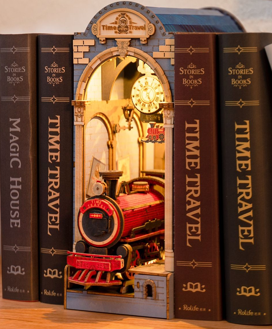 Robotime - Rolife Time travel Book Nook TGB04 3D wooden DIY miniature dollhouse kit is a train station that can take you to a different time and space. We have provided you with all the pieces and tools for you to create this cool miniature station scene. Have fun assembling all the parts together, and you'll get a unique book nook shelf insert and home decor! Hurry up, the train is about to leave!